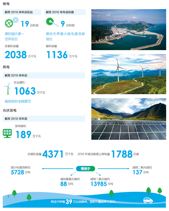 空氣無邊界,共飲一江水。在嚴(yán)峻的環(huán)境挑戰(zhàn)前,堅(jiān)持“善用自然的能量”的中廣核站在了藍(lán)天保衛(wèi)戰(zhàn)的最前列,在踐行低碳發(fā)展中,打出了響亮的一槍。2016年,中廣核清潔能源上網(wǎng)電量達(dá)1788億度,等效減少標(biāo)準(zhǔn)煤消耗約5728萬噸,減少氮氧化物排放約88萬噸,減少二氧化碳排放約13985萬噸,減少二氧化硫排放約137萬噸,相當(dāng)于種植39萬公頃森林,其面積可覆蓋兩個(gè)深圳市。