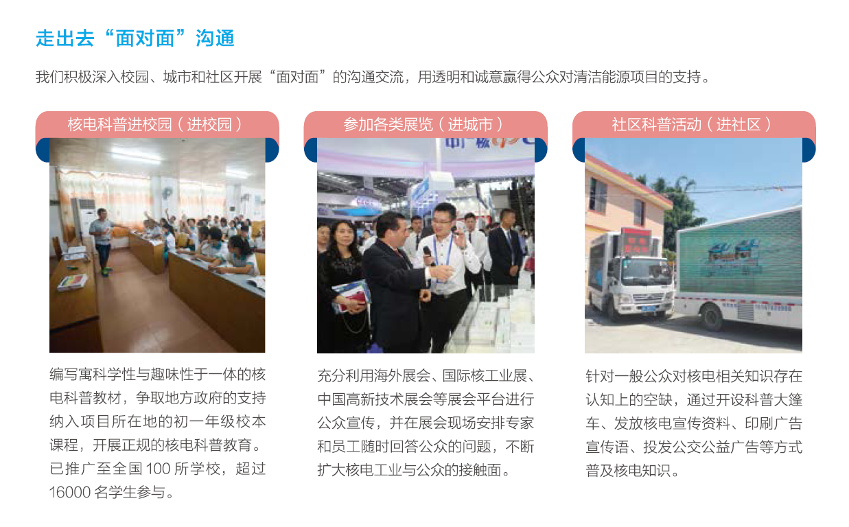 在向社會(huì)提供安全、清潔、高效能源的同時(shí),中廣核致力于傳播清潔能源科普知識(shí)、增進(jìn)公眾對(duì)清潔能源的理性認(rèn)識(shí),積極打造“透明核電”品牌。報(bào)告中,中廣核舉辦的各項(xiàng)展覽接待參觀者超過6萬人,六大在運(yùn)核電基地參觀公眾累計(jì)突破50萬人;核電科普課程在全國九個(gè)核電項(xiàng)目周邊超過100所學(xué)校落地,參與學(xué)生超過16000人。中廣核打造的“公眾開放體驗(yàn)日”等品牌活動(dòng),已成為全國核電行業(yè)的共同行動(dòng)。2016年底,公司獲頒電力行業(yè)“最佳透明度管理獎(jiǎng)”。