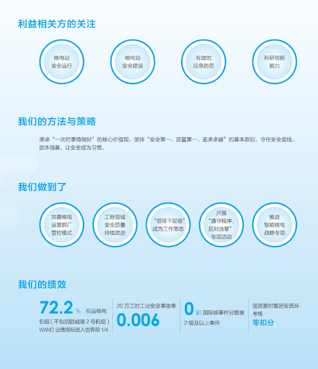 安全是核電企業(yè)的“安身之基,立命之本”,向來是公眾最為關(guān)心的話題,也是企業(yè)最大的社會(huì)責(zé)任。中廣核秉持“一次把事情做好”的核心價(jià)值觀,以工匠般的專注、細(xì)致與認(rèn)真,持續(xù)提升安全建造與運(yùn)行水平,加強(qiáng)自主創(chuàng)新能力,以安全質(zhì)量和技術(shù)創(chuàng)新不斷刷新安全運(yùn)行記錄。